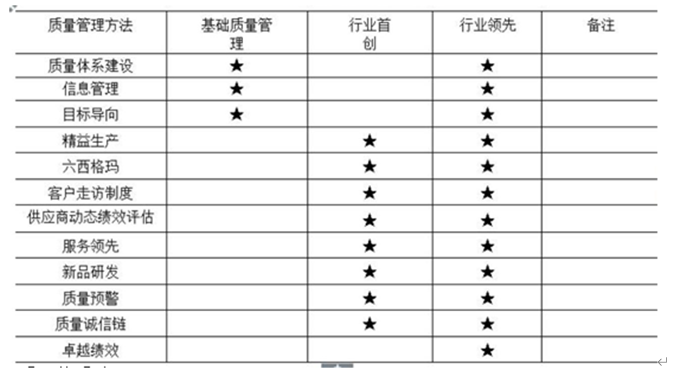 公司通過對(duì)內(nèi)外部環(huán)境、競(jìng)爭(zhēng)對(duì)手和標(biāo)桿進(jìn)行分析,同時(shí)從宏觀環(huán)境和顧客的需求及期望等方面考慮,在公司戰(zhàn)略委員會(huì)領(lǐng)導(dǎo)下制定了“我們以嚴(yán)謹(jǐn)、誠(chéng)信、創(chuàng)新、發(fā)展的意識(shí)為顧客提供超值的產(chǎn)品和服務(wù)”的質(zhì)量方針,對(duì)質(zhì)量職能規(guī)劃逐步細(xì)化,并落實(shí)到公司質(zhì)量方針目標(biāo)中進(jìn)行實(shí)施。